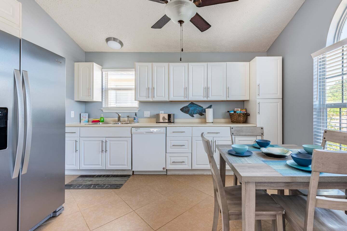 This beautiful family-friendly beach house is in an adorable, gated community with two pools and two parking spots in front of the home. This home sleeps 6 comfortably and features an outdoor fenced patio with a fire pit and gas grill for your family’s evening enjoyment. The home has been upgraded with Roku TVs with YouTube TV in the living room and all bedrooms. The kitchen is fully stocked for your cooking enjoyment and features new appliances, including the washer and dryer.